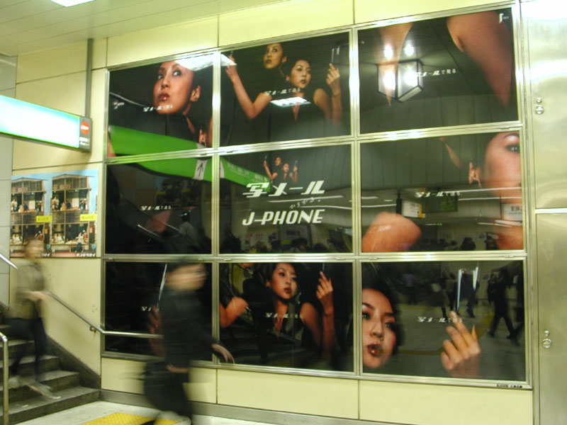 J-Phone's edgy black squares, promoting "sha--me-ru" picture mail. Of course she's a famous pop star.