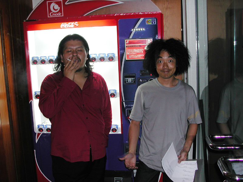 Kenji Eno and Hideto in front of the Coca-cola "C-Mode" machine they were programming.