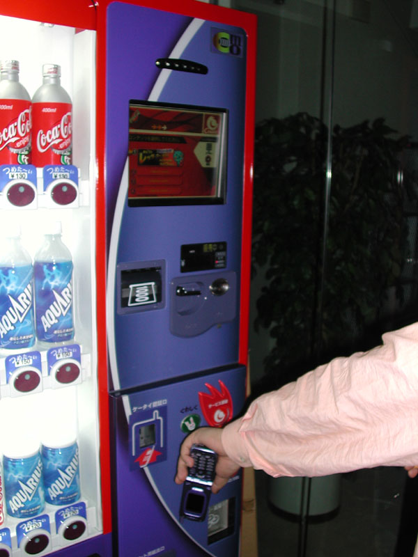 Buy a Coca-cola through your i-mode mobile phone, and a barcode shows up on your mobile phone screen. Swipe this in front of a reader on the vending machine and you'll get a beverage. Kenji calls this "kissing" - the "mouth" on the machine is "kissed" by your phone.