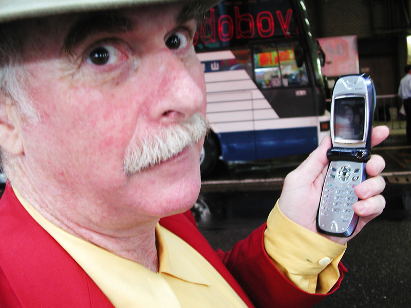 Howard Rheingold holds an NTT DoCoMo 3G FOMA video phone.