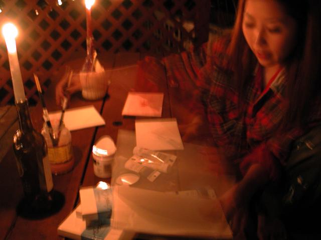 We'd been wrestling with her faily broad ambition - to travel, to get a stimulating job. Those are all nice things; I believe they stem from a root passion for a particular activity, aside from money or fame. She did take up web work a bit, perhaps an unavoidable fallout of being near me for two weeks. But she shared the fact that she'd never painted with mushy tangible paints (like oil and acrylic) so her last night in America, she sat outside in Oakland making paitings.