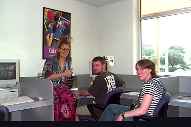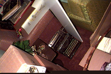 and howl by his computer desk in a smallish room at least with a lot of stuff and not a big window but at least a scanner and two macintoshes whoo boy