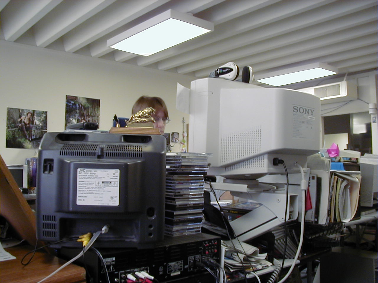 I'm sitting between Allan (large and white) and Brandon (scrawny and black). I was PlayStation editor at the time, so you can see my TV with a PlayStation game running (maybe Soul Blade? definitely paused), two light guns, two controllers, mobile phone, Nintendo brand cordless headphones. I had been playing Jagged Alliance 2 for Firing Squad. Warren's Lion's Club desk ornament is sitting on top of my TV. ![]()