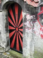 Next to a traditionally psychedlic red and black painted door, someone spraypainted "Just Want the $!" This was near the top of the fortified hill of Thun, where the current-day castle embattlements make a great place for Thun's teenagers to smoke hash and look out over the city. |