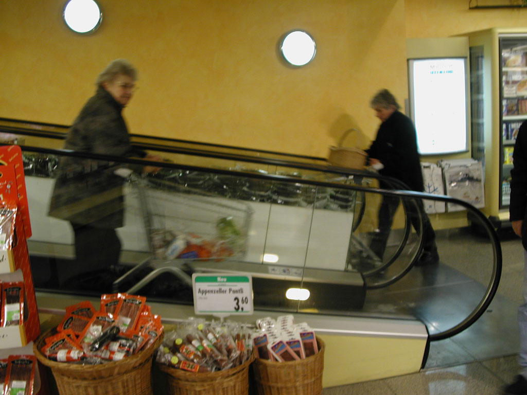 In the Migros, a popular mega-mart chain, a gently sloped escalator promises a rise and fall for people and shopping carts alike. |