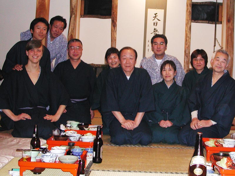 morning lovlies in the pool The next morning I was hungover and feeling inclined to lay in bed, nursing a sorry stomach. But I figured the Japanese must consider these baths a hangover cure. On the path on my way to the baths, I ran into the English speaking gent leaving for work; he bid me "auf weiderzein." In the pool was Itoi-san and a gentleman who said he was the president of a home construction company (who isn't most of these photos). We discussed some of the various animals that might be likely to visit these hotsprings along with us (deer? bears? monkeys?). Also, they related that hanko-man had been at the baths at 4am, and he had seen two pretty young ladies (美人). They were as chatty with me in the morning as they were the night before; I was glad to see that my party behaviour was not an impardonable affront. After watching so many Japanese people throw up on the subway platforms in Tokyo, I'm inclined to believe that drinking too much is widely forgiven here. Still no more pleasant - I hope I wiped that toilet down enough. Maybe Hidaki covered for me. Very nice people these were! At one point I had the urge to sing some songs, I suppressed them. I wonder if I should have? I'll save them for next time; the construction president says he's been here upwards of thirty times, for "business meetings." A teacher, a propane gas salesman, a construction company president, a consultant, a hanko maker - I don't know how they knew each other, why they were there together, and who these three women were. I asked more than once! I didn't get the answer. Maybe the answer was Itoi-san's birthday. Happy birthday! PostScript: I talked with Motegi-san, and showed her these photographs; she knew all these men; they come once a month for a kai-gi - meeting here, coordinated by the sensei. She had taken some of the photographs of us eating and I hadn't recognized her or remembered! (I hadn't met her yet). She gave me their names - sugiyama-shatcho (glasses), yamada-san (sensei), odashima-san (arkansas), horie-san (hanko). The food was special for the occasion; not the usual from Tsurunoyu.