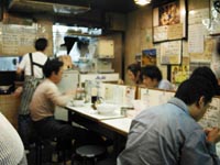 After eating garlic pork ramen a few times, I ventured to try their tomato ramen; a ramen combination you won't find a too many other restaurants. I ate here my first night after I moved to Japan, because it was close to my Uguisudani mansion. I thought it was sure strong and tasty. Then I ate at some other ramen restaurants and they served hard boiled eggs, or machine processed meat, or thin, salty or just hot spicy broth. I longed for the nourishment of Tetsugakudou. Returning regularly, I was occasionally struck by the ramen; I was not prepared to eat it. There must be a proper sort of hunger before one can eat here. It is rich beyond compare. At seven hundred yen per bowl. In April 2002, I visited with a Japanese friend. I was truly delighted when she pointed out that Tetsugakudou, the name means "philosophy house." I sat beaming through the meal after that - there's something deep about their bowl of ramen, I knew, but that it was philosophy this ramen shack I've been enjoying, well it just made it seem ever more my home. The daughter of the owners was there, she knew of me since I had presented them with my meishi telling them I had written about them on my web site. She introduced herself and we spoke of the restaurant and ramen just a few moments before the busy Saturday lunch swell reabsorbed her. She said that Tetsugakudou originated in Yokote, in Akita. It's too much of a coincidence - this is the one of three other places in Japan where I've spent more than five nights. They believed in being focused on excellent ramen there. They only started making plain rice and kimchi to add to the menu when their customers demanded it. So they named the restaurant philosophy place to remember that it all started with a belief in strong ramen. I'm a believer!